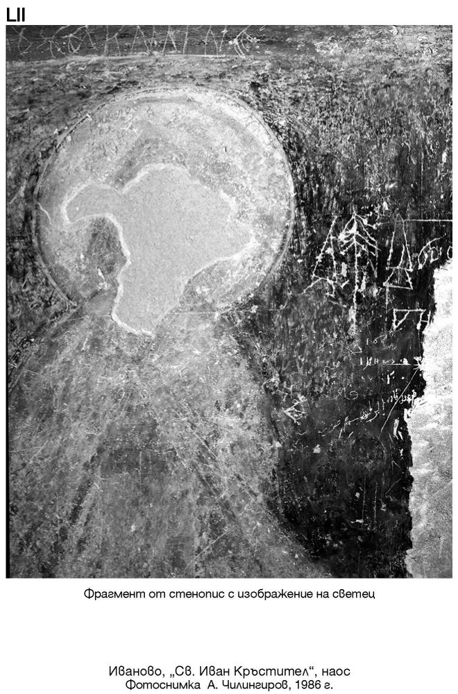 LII. Фрагмент от стенопис c изображение на светец. Иваново, „Св. Иван Кръстител“, наос. Фотоснимка А. Чилингиров, 1986 г.