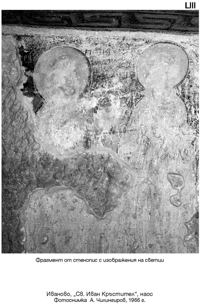 LIII. Фрагмент от стенопис c изображения на светци. Иваново, „Св. Иван Кръстител“, наос. Фотоснимка А. Чилингиров, 1966 г.