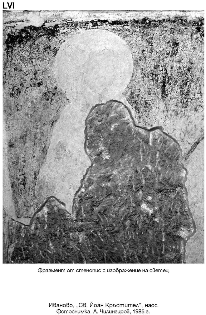 LVI. Фрагмент от стенопис c изображение на светец. Иваново, „Св. Йоан Кръстител“, наос. Фотоснимка А. Чилингиров, 1985 г.
