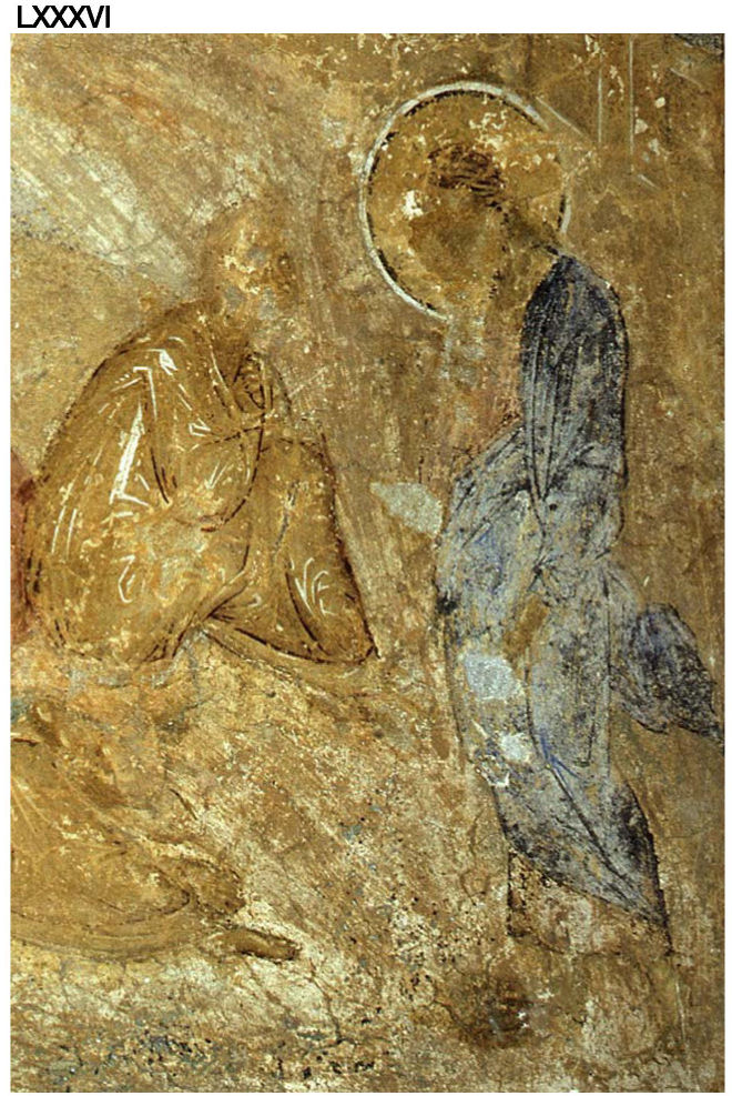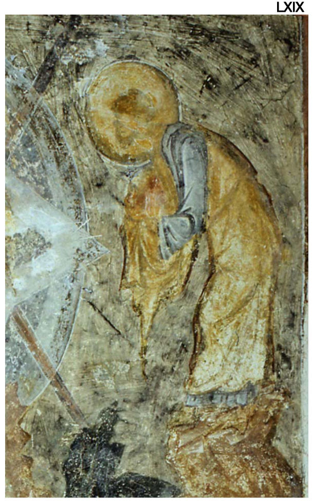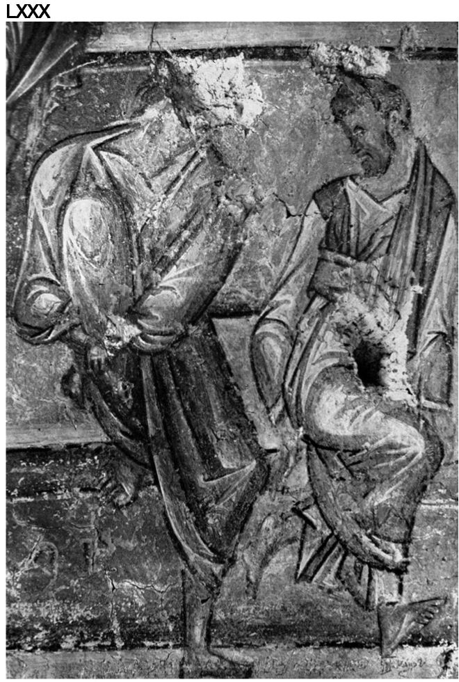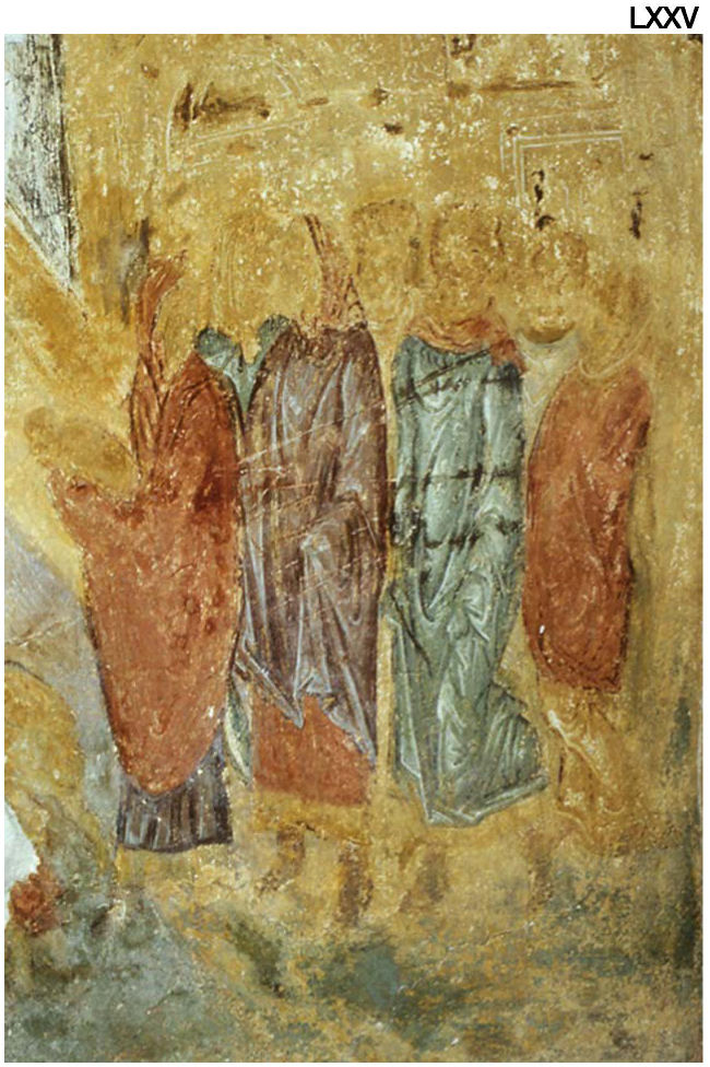 XLVIII. Фрагмент от стенопис с изображения на светци. Наос. Фотоснимка А. Чилингиров, 1985 г.
