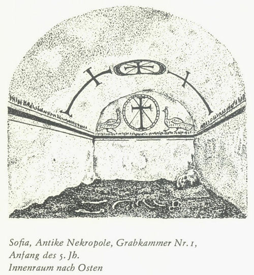 Eine Sonderstellung unter den frühchristlichen Denkmälern in Bulgarien nehmen die zahlreichen Grabkammern ein, die die Tradition vorchristlicher Grabstätten fortsetzen. Viele christliche Grabkammern sind auf dem Gebiet der ehemaligen Nekropole von Serdica ausgegraben und wieder zugeschüttet oder abgerissen worden; weitere Grabkammern befanden sich in Plovdiv, Krupnik und Buchovo. Einige wenige, wie die Grabkammern in Varna und Hissar, (Anm. 69, _70) sind - wenn auch in schlechtem Zustand - erhalten. Die meisten stellen kleine rechteckige Räume mit Tonnengewölbe dar und sind in unterschiedlicher, vor allem gemischter und Backsteintechnik ausgeführt.