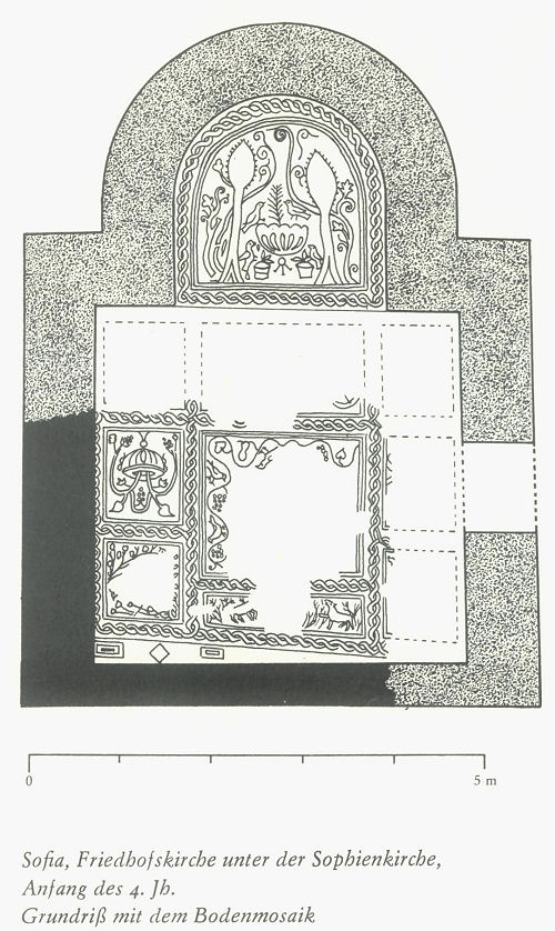 o Sofia, Friedhofskirche unter der Sophienkirche, Anfang des 4. Jh. Grundriß mit dem Bodenmosaik 21