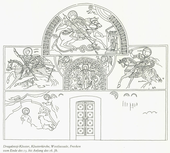Unabhängig von diesem Stilwandel bewahren die südwestlichen Gebiete Bulgariens während des ganzen späten Mittelalters eine starke Bindung an die Tradition in Stil und Technik, die man an einer Reihe von Denkmälern der Monumentalmalerei, wie des Demetrios-Klosters bei Boboschevo (1488), der Dorfkirchen in Mariza (Ende des 16. Jh.) (Abb. 184 bis 189) und Mala Zarkva sowie der Klosterkirchen in Alino und Seslavzi (Anfang des 17. Jh.), (Anm. 22) (Abb. 382) verfolgen kann. Neben mehreren ikonographischen Typen der frühchristlichen Kunst findet man auch eine Wiederbelebung der frühchristlichen Formensprache.