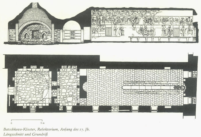 Batschkovo-Kloster, Refektorium, Anfang des 17. Jh. Längsschnitt und Grundriß