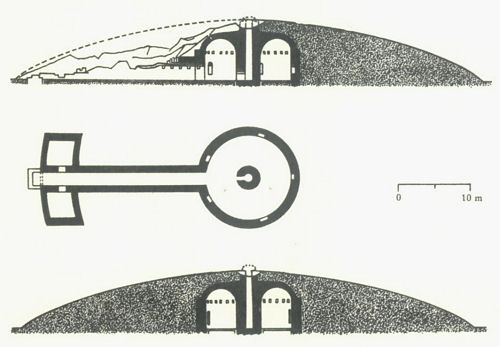 Im Unterschied zu den älteren thrakischen Grabstätten dürfte das südwestlich des antiken Anchialos am Schwarzen Meer gelegene thrakische Hügelgrab als Mausoleum gedient haben, in dem die Urnen mit der Asche der Verstorbenen aufgestellt wurden und mit dem Totenkultus verbundene Rituale stattfanden. Der 22 m lange, mit Tonnengewölbe überdeckte Dromos (Gang), der am Eingang von zwei rechteckigen und nur in ihrer Substruktion erhaltenen Kammern flankiert ist, führt in einen runden Saal von 11,60 m Durchmesser, in dessen Mitte sich eine hohle Säule von 3,50 m Durchmesser erhebt, die sich nach oben trichterartig verbreitert und in das umlaufende Gewölbe des Saals übergeht, so daß ein überwölbter Gang von 4,50m Breite und 5,50m Höhe entsteht.