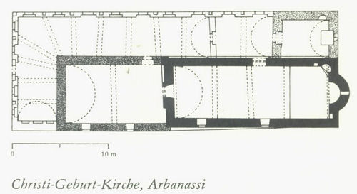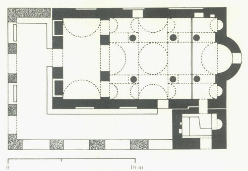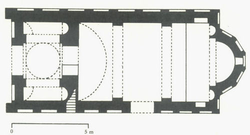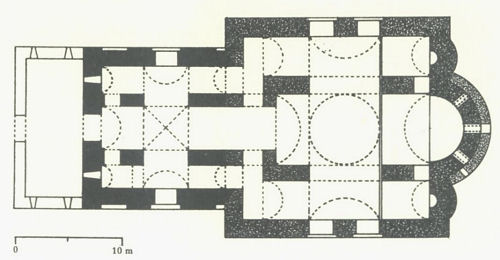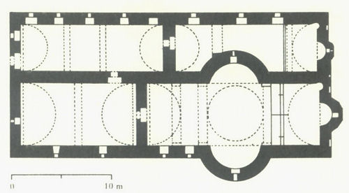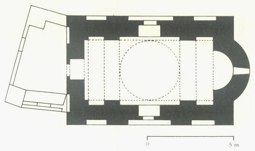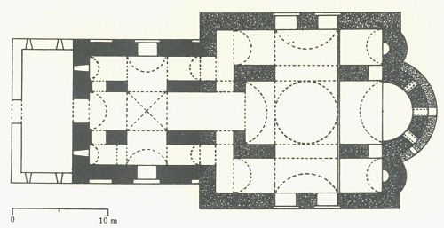 Nach den Hunneneinfällen 441-47 wurde eine neue befestigte Backsteinkirche errichtet - eine dreischiffige gewölbte und mit einem Satteldach überdeckte Pseudobasilika (46,50 x 23 m) mit polygonaler Apsis und Altarvorraum in der Höhe des Mittelschiffs sowie einem niedrigeren Querschiff, Emporen über dem Narthex und den Seitenschiffen, Mittelturm mit polygonalem Tambour und Pendentifs über der Vierung, gestützt von Säulen; das Mittelschiff von den Seitenschiffen durch massive Mauern mit Arkaden getrennt. Den dreigeschossigen ungeteilten Narthex flankierten zwei quadratische Abwehrtürme;