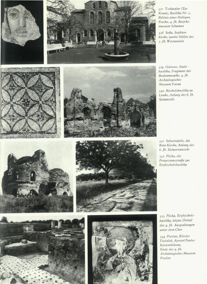 Der inmitten der frühchristlichen Nekropole östlich der antiken Stadt Serdica gelegenen Sophienkirche,. die mit wesentlichen Veränderungen, jedoch in der alten Bausubstanz erhalten geblieben ist, gingen vier Vorgängerbauten voran. Die erste Kirche, vermutlich unmittelbar nach dem Mailänder Edikt 313 oder kurz zuvor als capella memoria errichtet, war ein kleiner einschiffiger Bau (14 x 6 m) mit tiefer halbkreisförmiger Apsis, dessen Bodenmosaik sich zum Teil unter dem Fußboden der jetzigen Kirche befindet und zum Teil im Nationalmuseum Sofia aufbewahrt wird. Bei der zweiten, wahrscheinlich zu Beginn des letzten Drittels des 4. Jh. unter Verwendung von Resten des älteren .Baus errichteten Kirche handelte es sich um eine dreischiffige Basilika mit in der Ostmauer eingetiefter Apsis. Der dritte, nach dem zweiten Goteneinfall 378 entstandene Bau war wiederum eine dreischiffige Basilika, jedoch von einer größeren Ausdehnung. Die bis 1914 erhaltenen Teile des 144 m2 großen Bodenmosaiks ähneln dem ornamentalen Mosaik der ersten Kirche; das der vierten Kirche, um 400, mit geometrischen Ornamenten, ist nur fragmentarisch erhalten. Alle vier frühchristlichen Kirchen stellten einfache flach gedeckte Anlagen mit dünnen Mauern dar, die häufig durch feindliche Angriffe und durch Brände in Mitleidenschaft gezogen wurden.