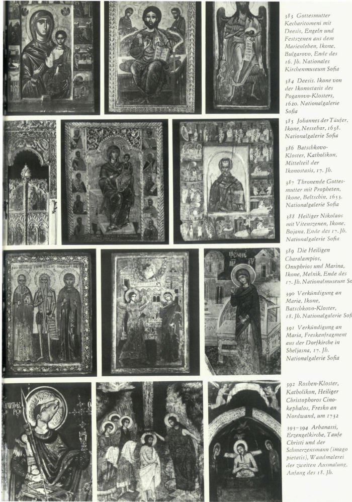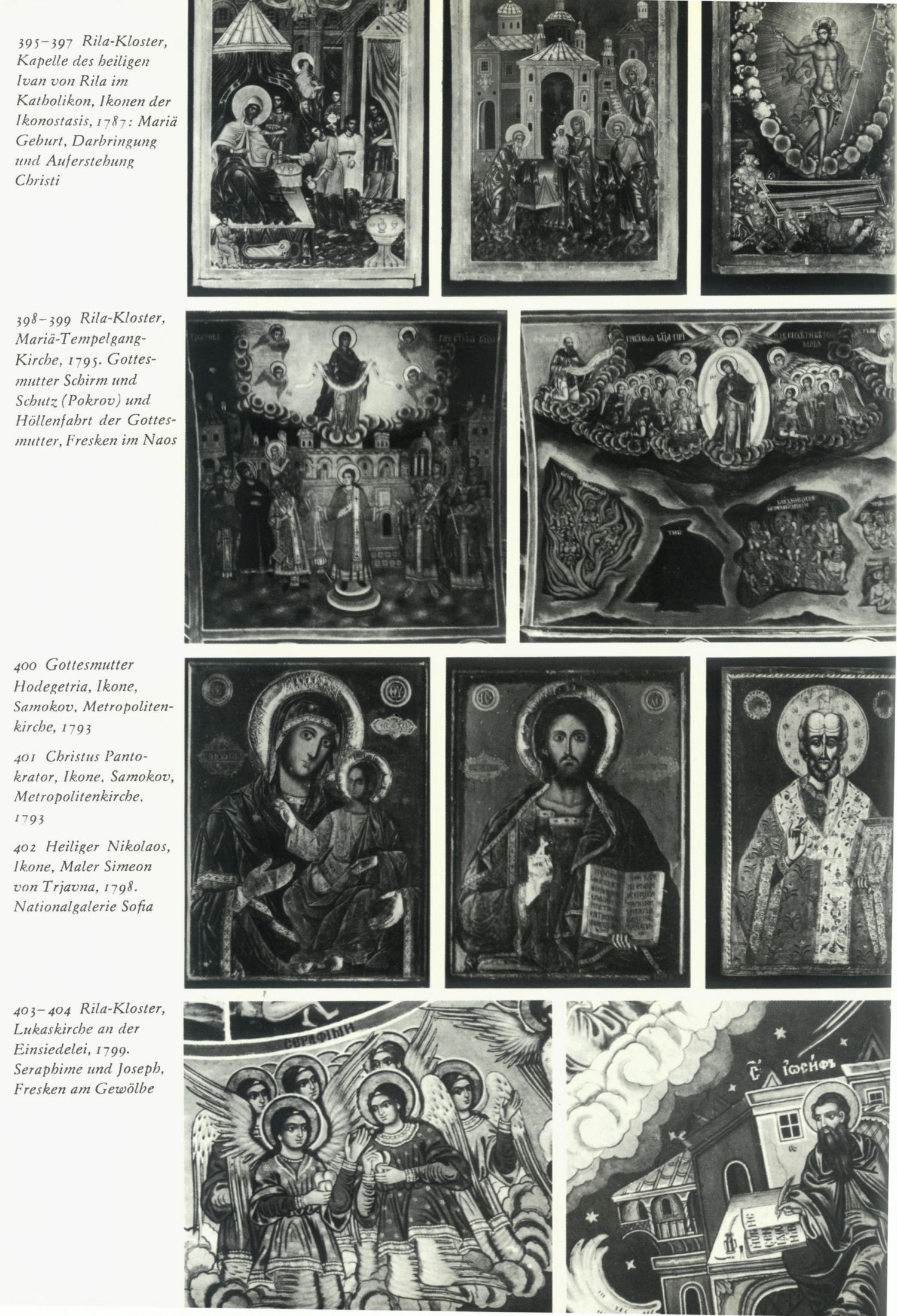 einige Ikonen sind vom athonitischen Mönch Zacharij signiert, der Ende des 18. Jh. zusammen mit Christo Dimitrov im Rila- Kloster tätig gewesen ist. In der Ikonographie sind auch Einflüsse Rußlands feststellbar, die in der Erneuerung der athonitischen Kunst Ende des i8./Anfang des 19. Jh. neben den abendländischen Einflüssen eine wichtige Rolle zu spielen begannen.
