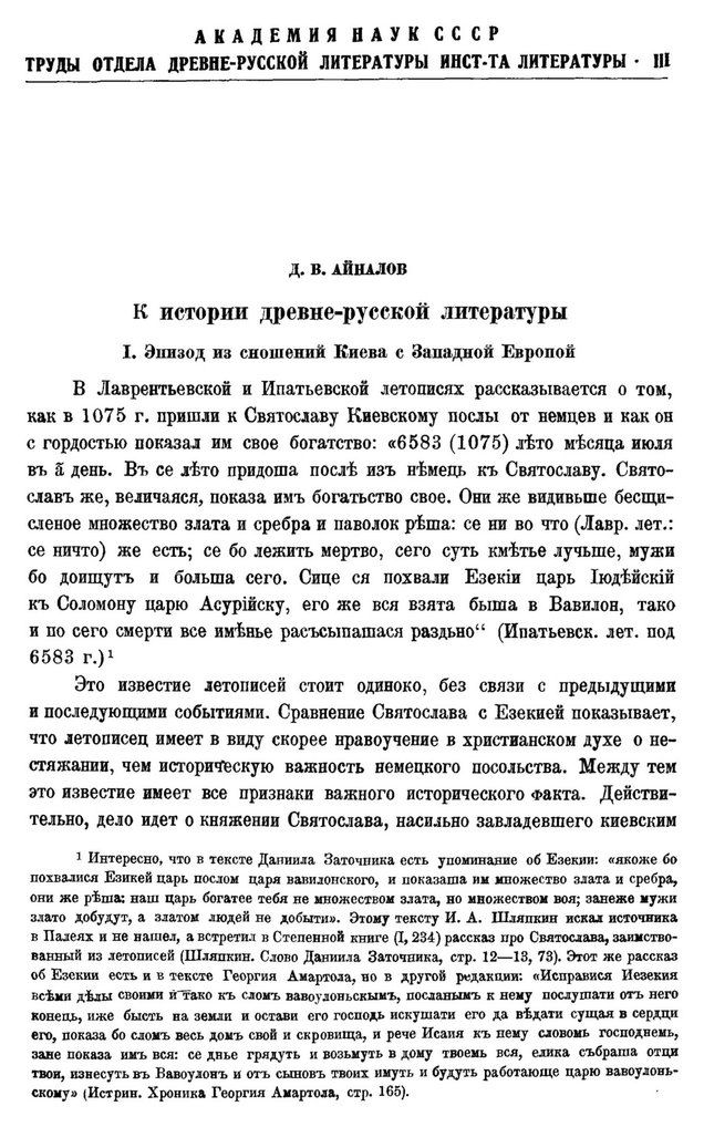 «6583 (1075) лѣто мѣсяца июля въ а҃ день. Въ се лѣто придоша послѣ изъ нѣмецъ къ Святославу. Святославъ же, величаяся, показа имъ богатьство свое. Они же видивьше бесщисленое множество злата и сребра и паволок рѣша: се ни во что (Лавр. лет.: се ничто) же есть; се бо лежить мертво, сего суть кмѣтье лучьше, мужи бо доищутъ и больша сего. Сице ся похвали Езекіи царь Іюдѣйскій къ Соломону царю Асурійску, его же вся взята быша в Вавилон, тако и по сего смерти все имѣнье расъсыпашася раздьно“ (Ипатьевск. лет. под 6583 г.) [1]
