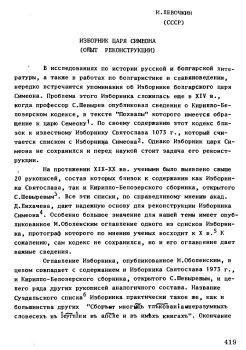 В исследованиях по истории русской и болгарской литературы, а также в работах по болгаристике и славяноведению, нередко встречаются упоминания об Изборнике болгарского царя Симеона. Проблема этого Изборника сложилась еще в XIV в., когда профессор С. Шевырев опубликовал сведения о Кирилло-Белозерском кодексе, в тексте "Похвалы" которого имеется обращение к царю Семеону [1]. По своему содержанию этот кодекс близок к известному Изборнику Святослава 1073 г., который считается списком с Изборника Симеона [2]. Однако Изборник царя Симеона не сохранился и перед наукой стоит задача его реконструкции.