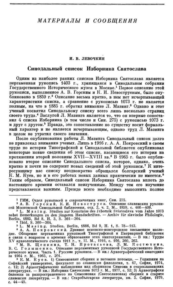 После опубликования работы Л. Мазинга Синодальный список долго не привлекал внимания ученых. Лишь в 1916 г. А. А. Покровский в своем труде по истории Типографской и Синодальной библиотек опубликовал некоторые новые сведения об этом списке, касающиеся его истории на протяжении второй половины XVII—XVIII вв. [6] В 1965 г. было опубликовано второе описание Синодального списка, которое, однако, очень кратко и почти не содержит новых сведений об этой рукописи. [7] К интересующему нас списку неоднократно обращался болгарский ученый К. М. Куев, но и в его работах новых данных практически не имеется. [8] Таким образом, Синодальный список Изборника Святослава вплоть до настоящего времени оставался неизученным. Между тем его изучение представляется важным. Прежде всего необходимо выполнить полное