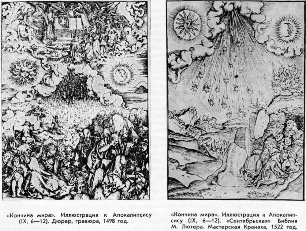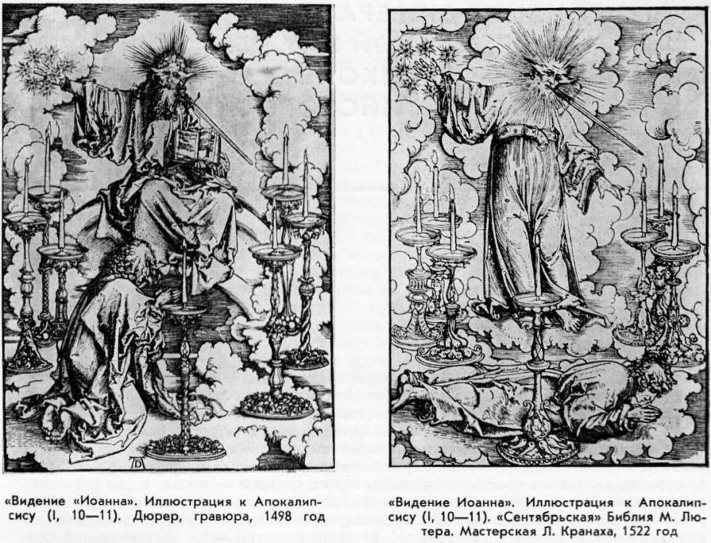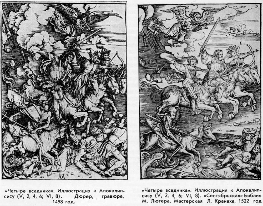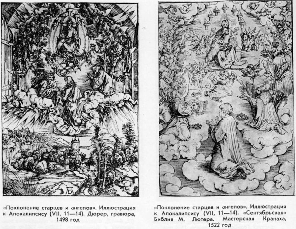 распространенного художественного произведения, как его цикл гравюр на дереве «Апокалипсис», имевший множество копий и переработок. Отпечатанный впервые в 1498 году в двух редакциях — немецкой и латинской,— этот цикл копируется уже в 1502 году Иеронимусом Греффом в Страсбурге [15]. Вслед за вторым изданием дюреровского цикла в 1511 году с уменьшенным изданием копий в 1515—1516 годах выступает Алессандро Паганини в Венеции [16]. Исключительно большое значение для распространения графического цикла Дюрера имело включение «Апокалипсиса» Мартином Лютером в первое издание своего перевода Библии, вышедшее в сентябре 1522 года в Виттенберге (так называемая «Сентябрьская» Библия). Ее иллюстрации были созданы на основе дюреровских гравюр, по указаниям Лютера, в мастерской Кранаха [17]. Четырнадцать гравюр Дюрера увеличились до двадцати одной, причем некоторые сложные композиции были разделены на две сцены, а две композиции исключены.