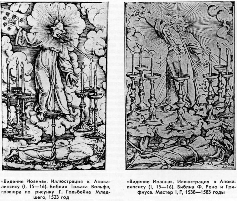 «Видение Иоанна». Иллюстрации к Апокалипсису (I, 15—16). Библия Томаса Вольфа, гравюра по рисунку Г. Гольбейпа Младшего, 1523 год 327