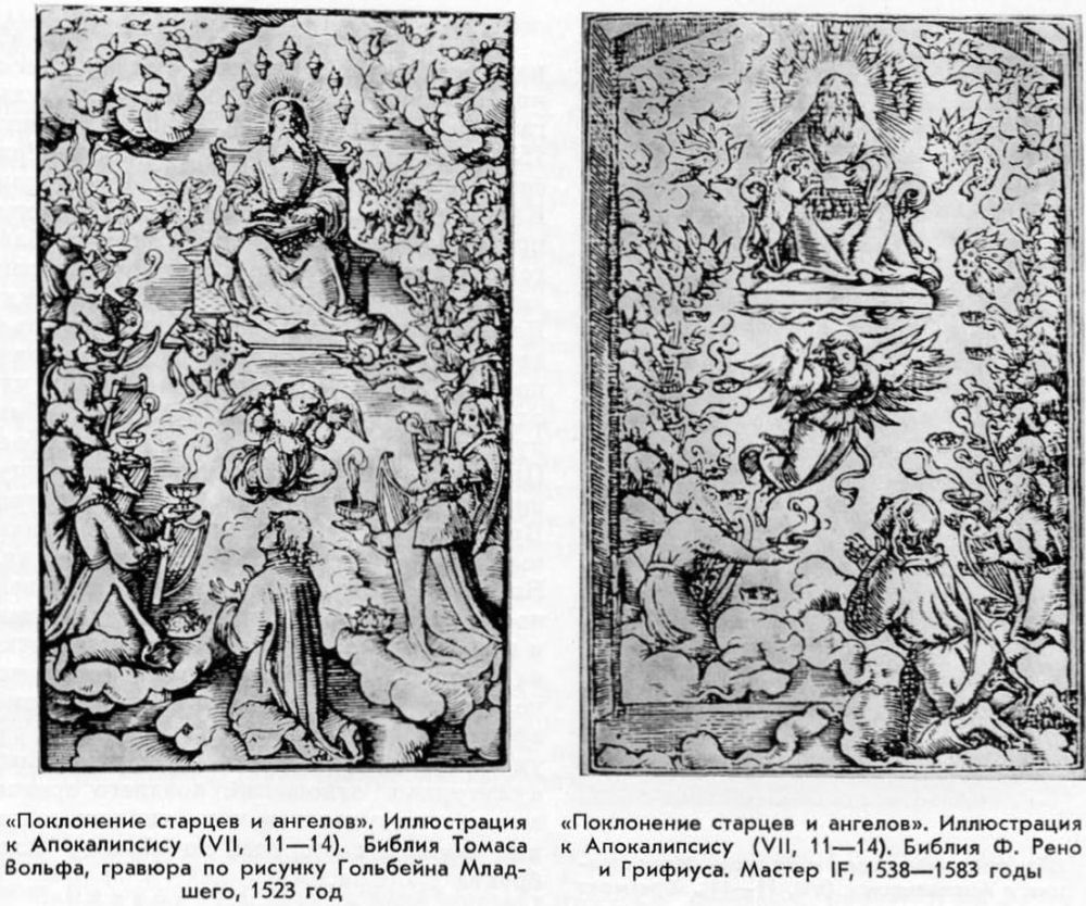 Уже иллюстрации «Сентябрьской» Библии Лютера, а они заметно меньше гравюр Дюрера [44], показывают в сравнении с оригиналом известную композиционную упрощенность. При Гольбейне размеры гравюр были вновь наполовину уменьшены, а композиции — еще более упрощены. Когда гравер иллюстраций Библии Рено — Грифиуса был принужден еще уменьшить их размеры (что определяется форматом издания в малую октаву), он, вероятно, следуя указанию издателя, внес некоторые изменения в сцены — в первую очередь устранил некоторые политически неприемлемые детали, которые были заимствованы Гольбейном из «Сентябрьской» Библии, как, например, папскую тиару на апокалиптическом звере, одновременно уточнив в соответствии с текстом отдельные элементы изображения, типа небесных врат второй сцены.