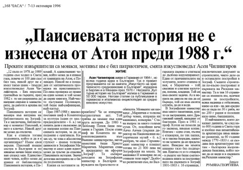2. Асен Чилингиров: „Паисиевата история не е изнесена от Атон преди 1988 г.“ (Интервю с Румяна Георгиева в „168 часа“, 7-13 октомври 1996)