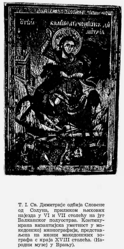 T. I. Св. Димитрије одбија Словене од Солуна, приликом њихових најезда y VI и VII столећу на југ Балканског полуострва. Икона македонских зографа с краја XVIII столећа. (Народни музеј y Врању);