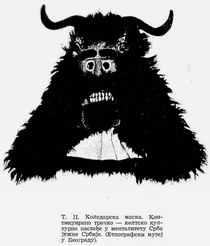 Pl. II. Masque de koledari (chanteurs des chansons de Noël ou de Jour de l’An). Héritage thraco-celte continu dans la mentalité des Serbes — habitants de la Serbie du Sud. (Musée Ethnographique de Belgrade);