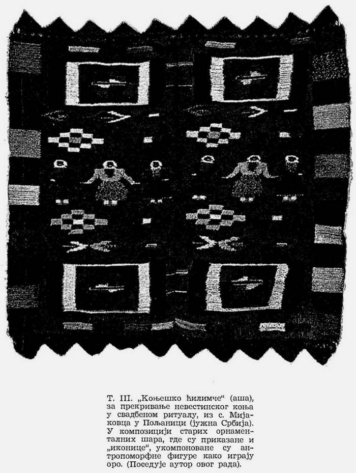 T. III. „Коњешко ћилимче“ (аша), за прекривање невестинског коња y свадбеном ритуалу, из с. Мијаковца y Пољаници (јужна Србија); са приказом антропоморфних фигура. (Поседује аутор овог рада).