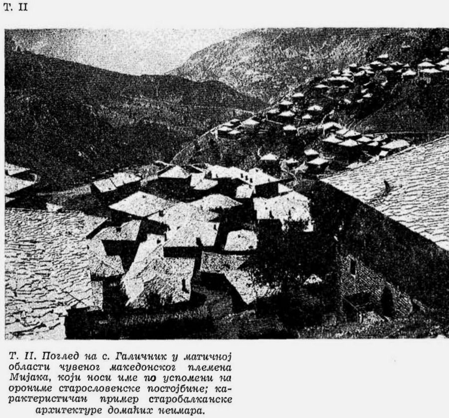 Pl. II. Vue du village de Galičnik dans la région mère de la fameuse tribu macédonienne de Mijaci qui porte le nom en mémoire des oronymes dans le pays d’origine des anciens slaves; exemple caractéristique de l’architecture paléobalkanique, oeuvre des constructeurs locaux;