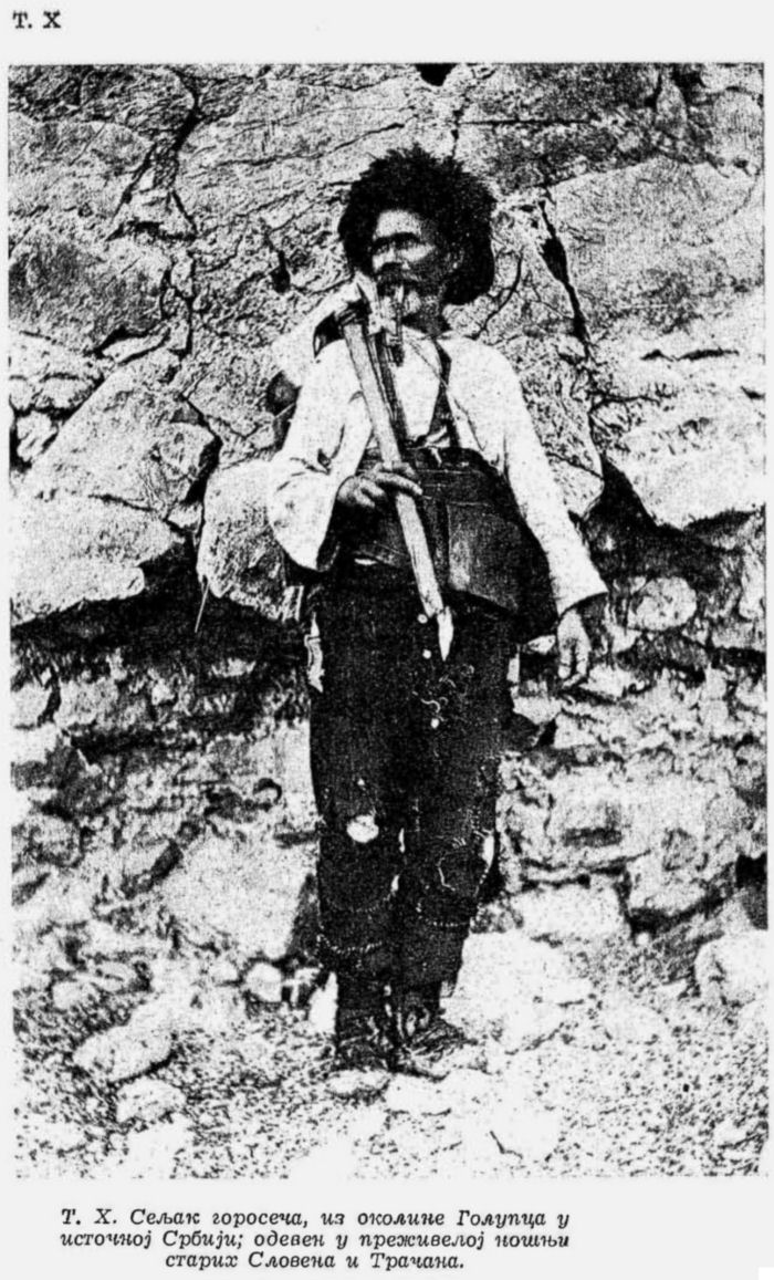 Pl. X. Paysan bûcheron, des environs de Golubac dans la Serbie de l’Est; vêtu de costume suranné des vieux Slaves et des Thraces;