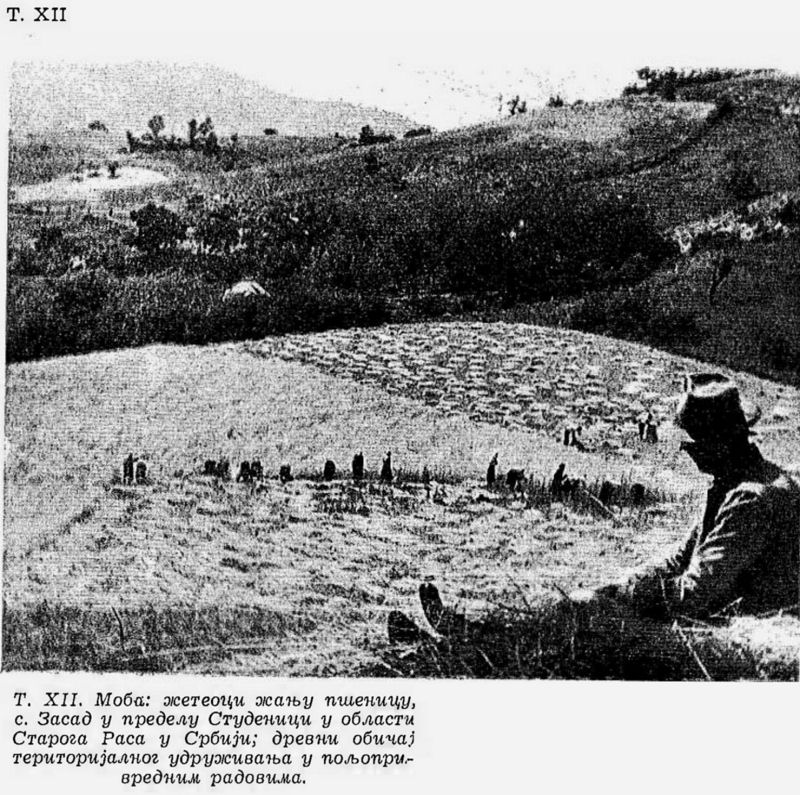 Pl. XII. Moba (travail collectif gratuit): moissonneurs moissonnent le blé, village de Zasad dans la région de Studenica dans la province de Stari Ras en Serbie; coutume ancienne d’association territoriale pour effectuer les travaux de champs;