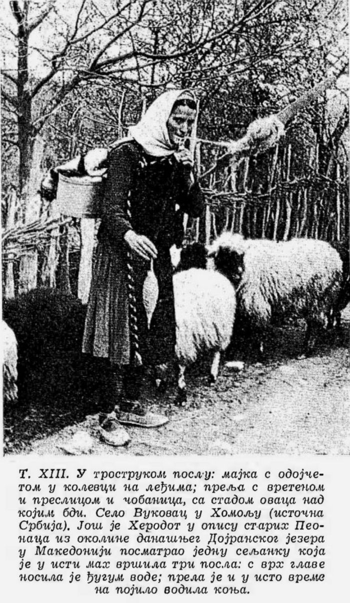 Pl. XIII. En triple besogne: mère avec le nourrison dans le berceau qu’elle porte sur le dos; fileuse avec fuseau et quenouille et bergère avec le troupeau de moutons qu’elle garde. Village de Vukovac dans la région de Homolje (Serbie de l’Est). Dans sa description des anciens Péoniens des an virons du Lac de Dojran en Macédoine Hérodote a déjà observé une paysanne qui faisait une triple besogne: elle portait un broc d’eau sur la tête, filait et en même temps menait un cheval à boire;