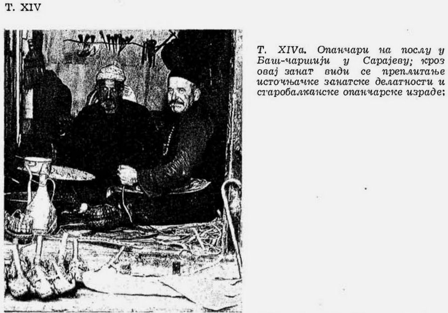 Pl. XIV(a). Cordonniers qui font des opanques au travail à Baš čaršija (marché) de Sarajevo; dans ce métier on voit l’entrelacement de l’activité artisanale orientale et la fabrication paléobalkanique des opanques;
