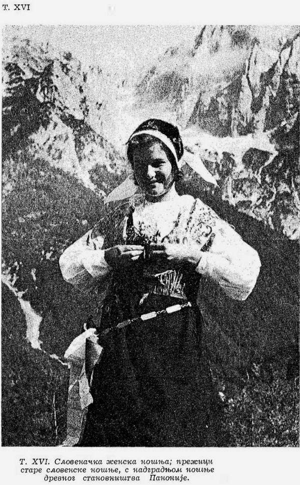 Pl. XVI. Costume de femme Slovène: survivances de l’ancien costume slave aux éléments du costume de la population antique de la Pannonie;
