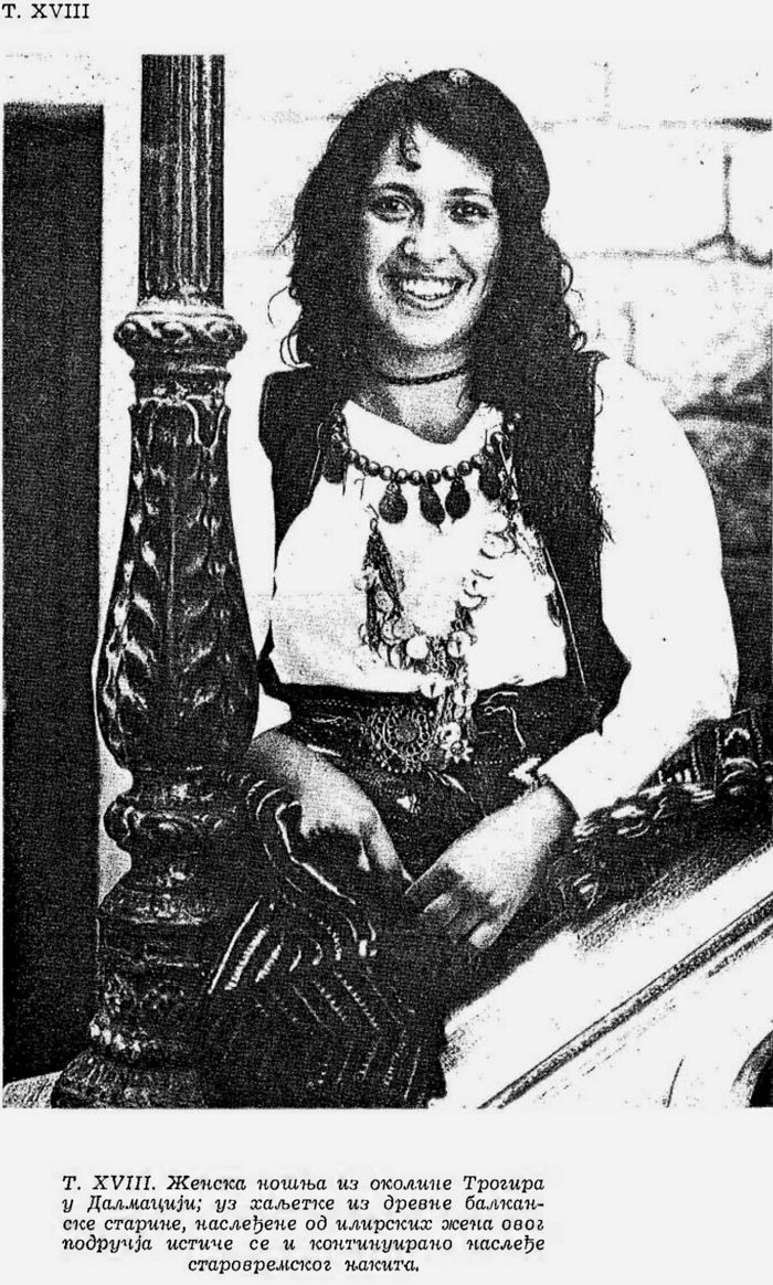 Pl. XVIII. Costume de femme des environs de Trogir en Dalmatie; outre les pièces datant de l’antiquité balkanique, héritage des femmes illyriennes de cette région, on distingue aussi l’héritage de l’ancienne parure;