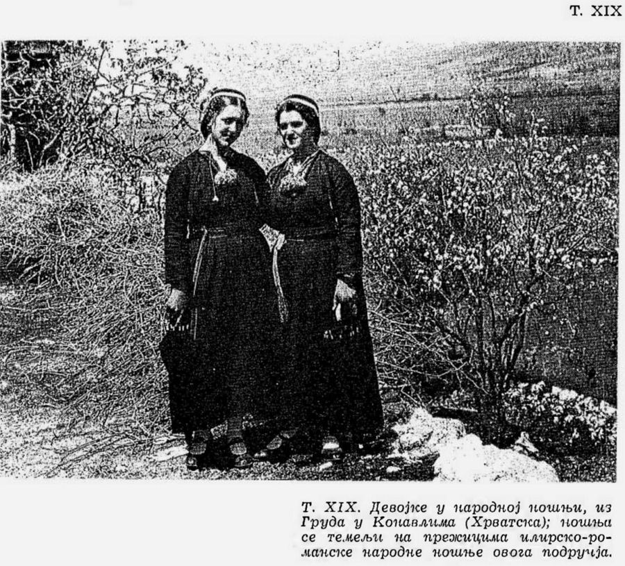 Pl. XIX. Jeunes filles en costume populaire, de Grude dans la région de Konavli (Croatie); ce costume est basé sur les survivances du costume populaire illyrien-roman de ce territoire;