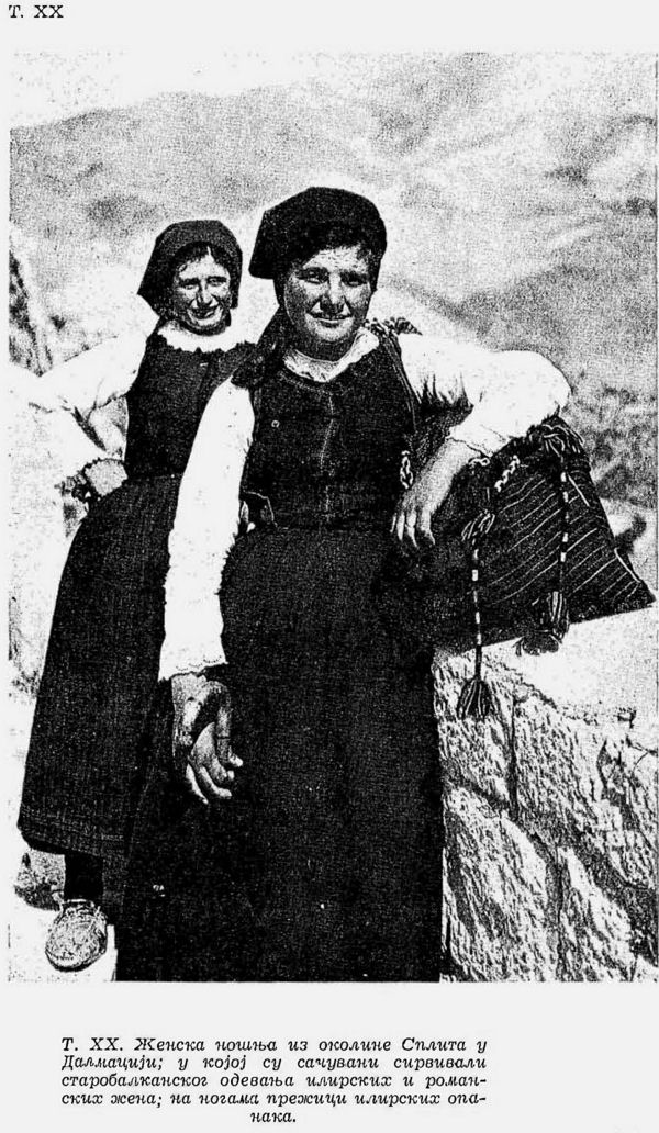 Pl. XX. Costume de femme des environs de Split en Dalmatie dans lequel sont conservées les survivances de l’ancien costume balkanique des femmes illyriennes et romanes; aux pieds survivances des opanques illyriennes;