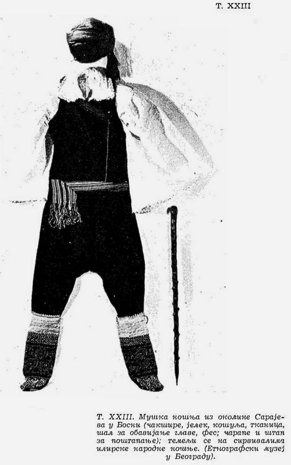 Pl. XXIII. Costume d’homme des environs de Sarajevo en Bosnie (pantalon, gilet, chemise, ceinture tissée, bande d’étoffe à enrouler autour de la tête, fez, chaussette et canne à s’appuyer en marchant). (Musée Ethnographique à Belgrade);