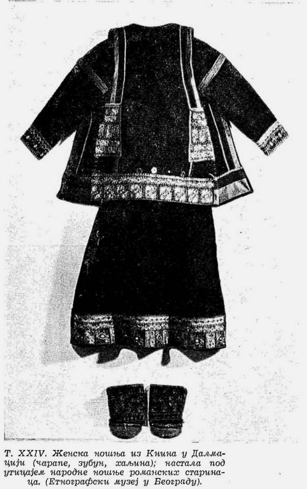 Pl. XXIV. Costume de femme de Knin en Dalmatie (bas, zubun -sorte de gilet-, robe); il s’est formé sous l’influence du costume populaire de la population romane autochtone. (Musée Ethnographique de Belgrade);