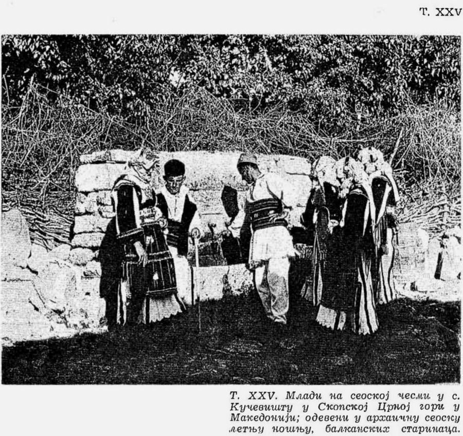 Pl. XXV. Jeunes gens à la fontaine du village à Kučevište dans la région de Skopska Crna Gora en Macédoine; habillés en costume archaïque d’été de la orientale et la fabrication paléobalkanique des opanques;