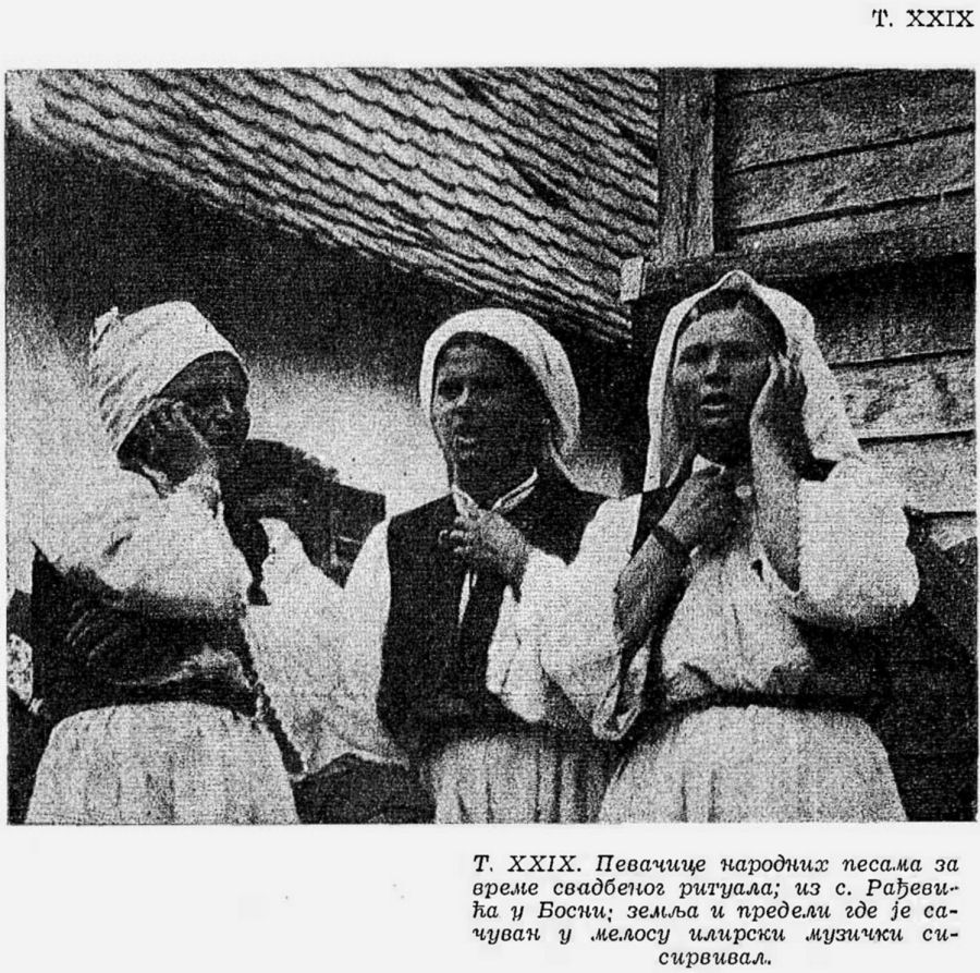Pl. XXIX. Chanteuses des chants populaires pendant la cérémonie du mariage; du village de Radjevié en Bosnie; pays et régions où est conservée la survivance de la musique illyriennne dans le mélos populaire;