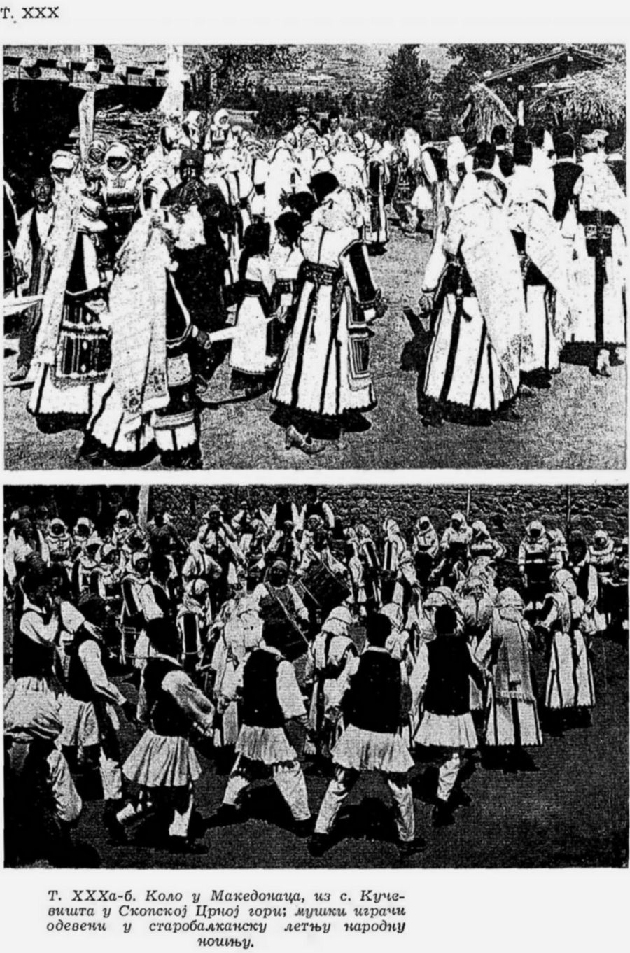 Pl. XXXa-b. Macédoniens dansant l’oro (ronde), du village de Kucevište dans la région de Skopska Crna Gora; les danseurs portent le vieux costume d’été balkanique;