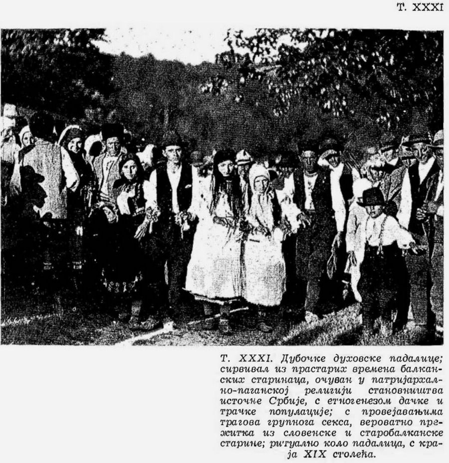 Pl. XXXI. Padalice (femmes qui tombent en transe) de Pentecôte à Duboka; survivance de l’antiquité profonde des aborigènes balkaniques, conservée dans la religion patriarcale-païenne de la population de la Serbie de l’Est, acec l’ethnogenèse des populations dace et thrace, avec les traces du sexe de groupe, probablement une survivance de l’antiquité slave et vieille balkanique; ronde rituelle des padalice de la fin du XIXe siècle;