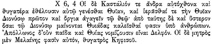 Споредъ това Павзаниево известие Тюия е почела първа Диониса и е въвела неговитѣ оргии, и затова всички жени, които се предаватъ на Дионисони оргии, биди наречени по-сетне θυίαδες или θυῖαι. [1]