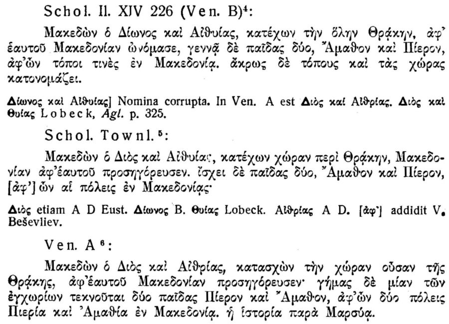 5. Срв. още Stephanus Byzant. s. v. Μακεδονία и Eustath. Dion. Per. 427. ὅτι Μακεδόνες λέγονται ἀπὸ Μακεδόνος τοῦ Διός въ F. Jacob y, F. Gr: Hist I 455.