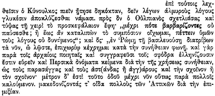 A писателътъ Атеней отъ Наукратисъ въ съчинението си Δειπνοσοφισταί III 121e — 122в съобщава въ свръзка съ единъ разговоръ за употрѣбата на чуждици следното :