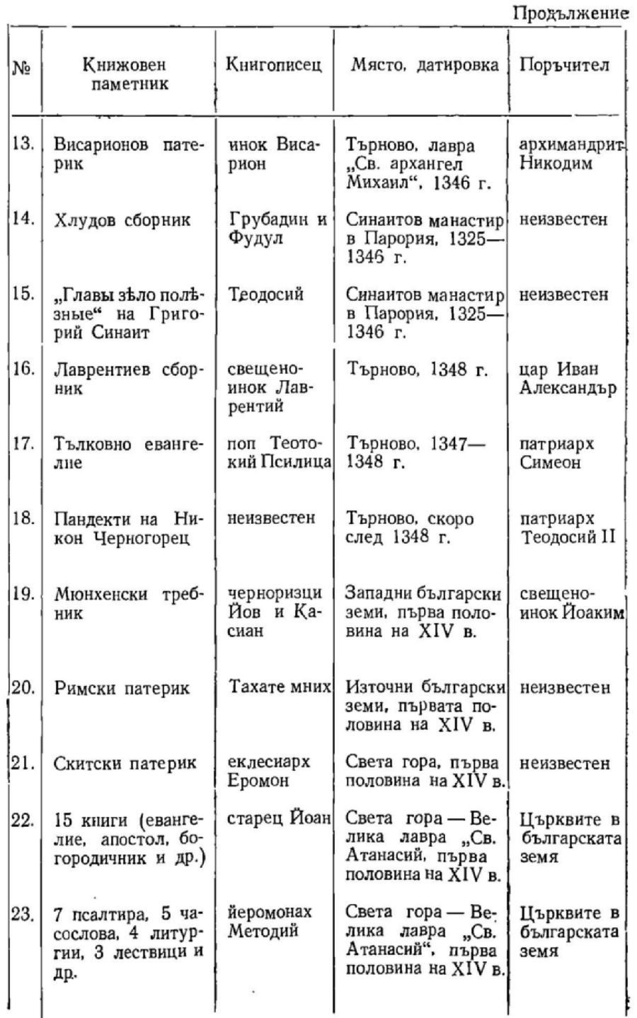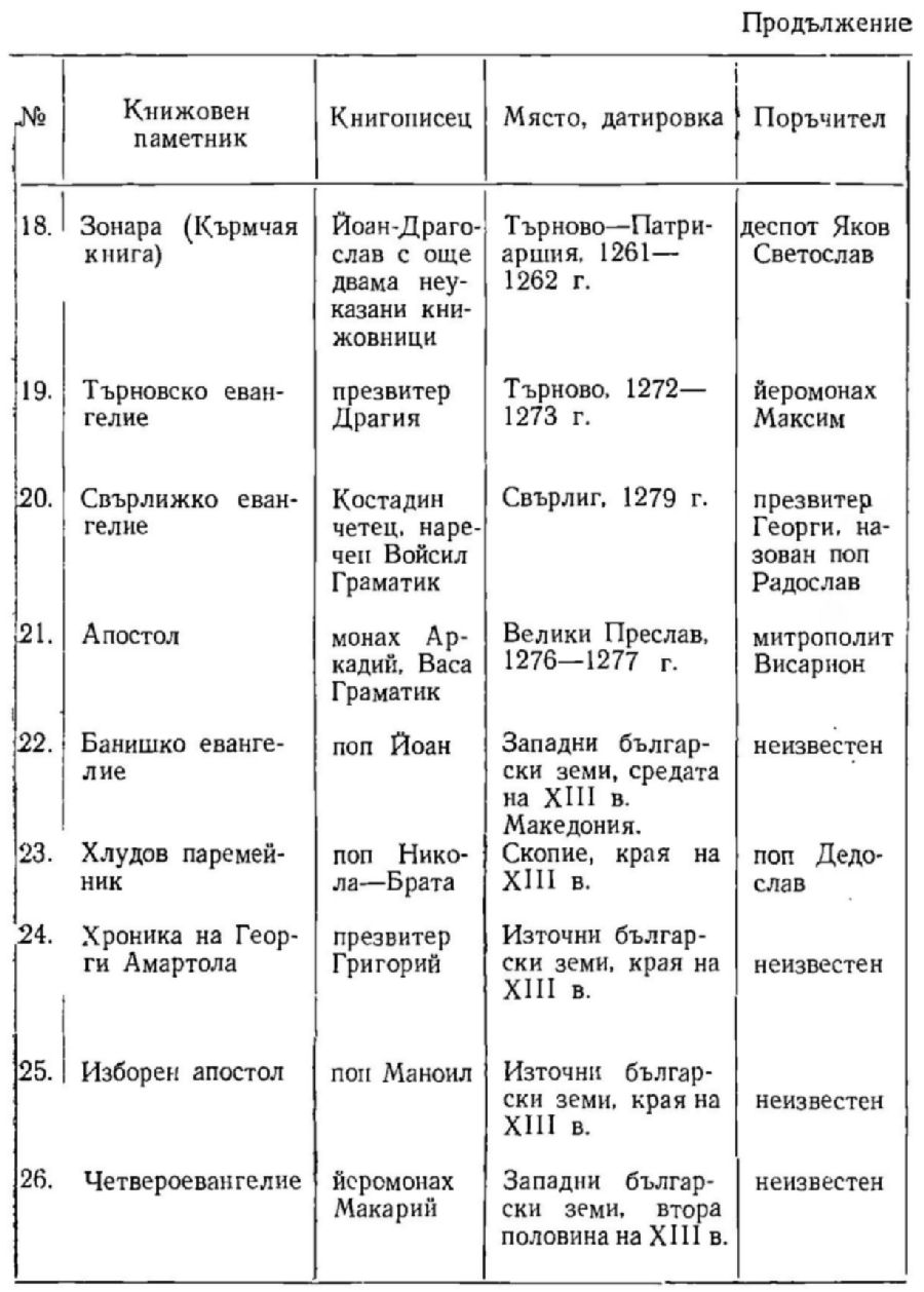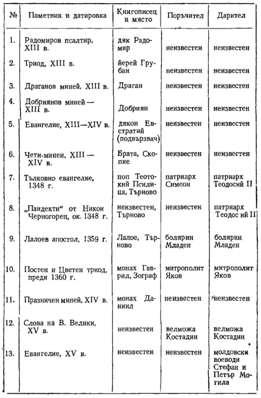 състав на създателите и поръчителите на книжовните произведения, се налага въз основа на достигналите до нас приписки и някои други странични данни да се изработят две сводни таблици — едната за края на XII и XIII в., а другата за XIV в., които в значителна степен ще облекчат наблюденията. Систематизацията и конкретизацията на сведенията е направена въз основа на опита и методиката на работа на някои известни съветски изследвачи на средновековната руска и славянска книга, между които на първо място трябва да бъде поставен Н. Н. Розов. [1]