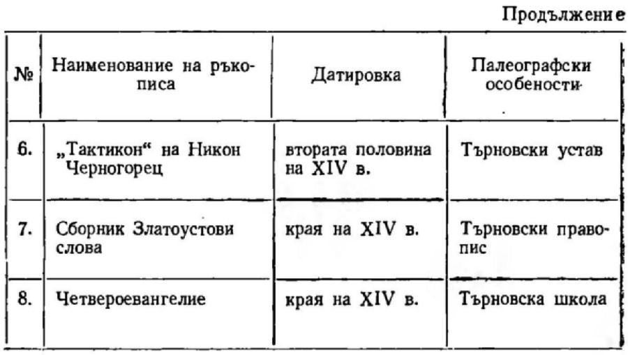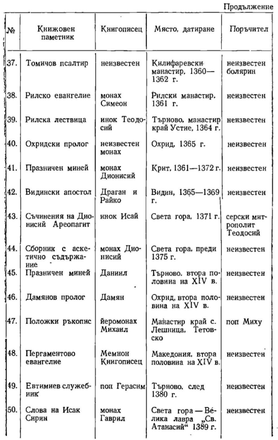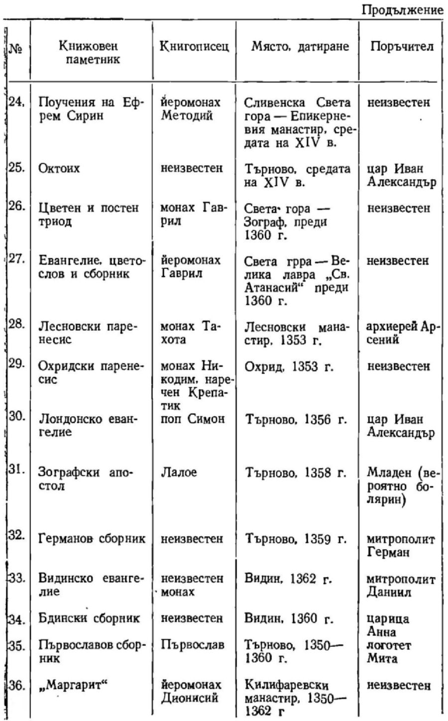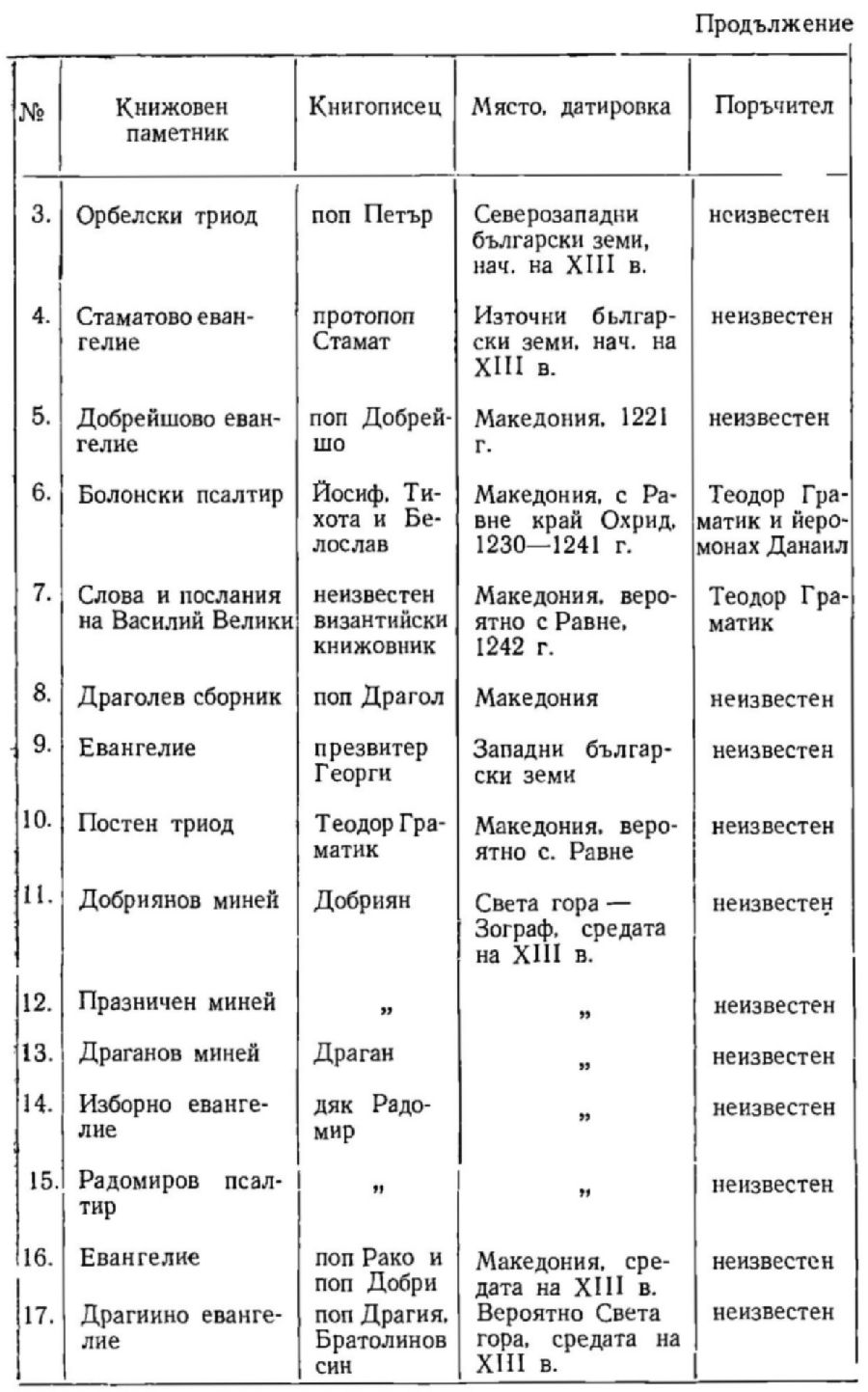 състав на създателите и поръчителите на книжовните произведения, се налага въз основа на достигналите до нас приписки и някои други странични данни да се изработят две сводни таблици — едната за края на XII и XIII в., а другата за XIV в., които в значителна степен ще облекчат наблюденията. Систематизацията и конкретизацията на сведенията е направена въз основа на опита и методиката на работа на някои известни съветски изследвачи на средновековната руска и славянска книга, между които на първо място трябва да бъде поставен Н. Н. Розов. [1]