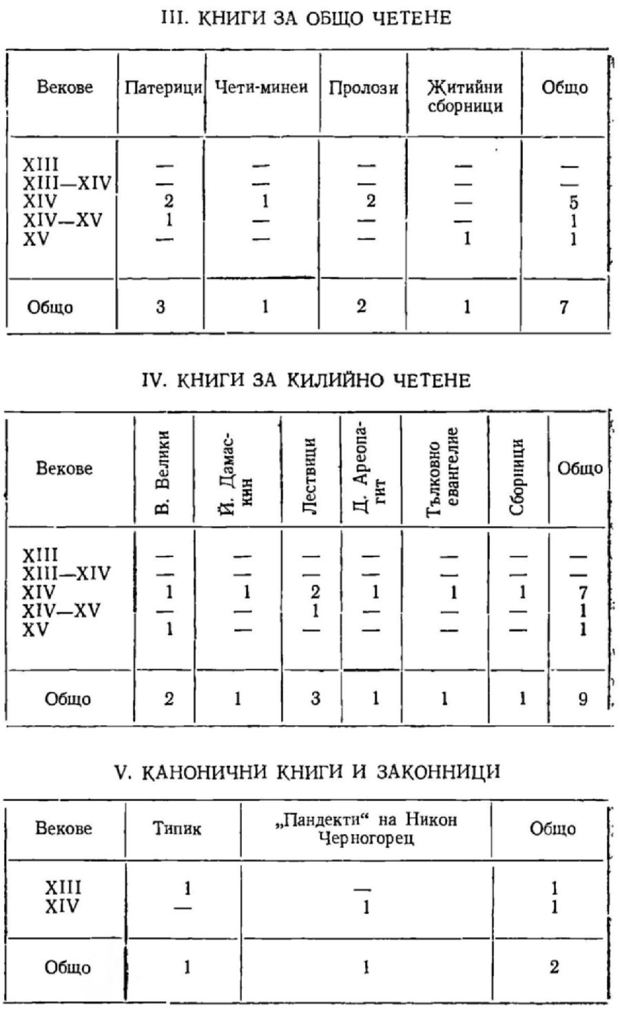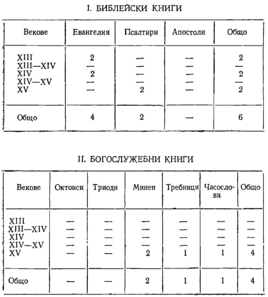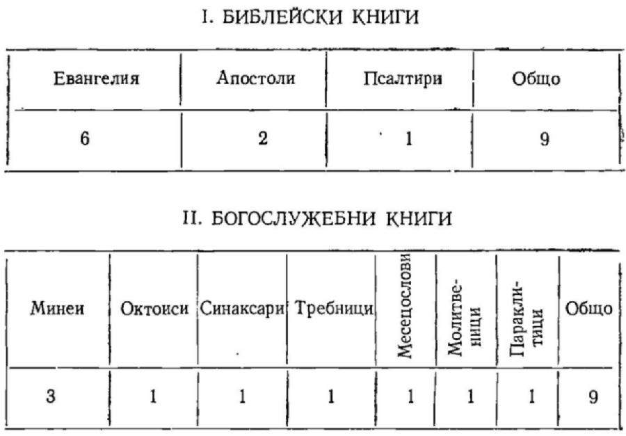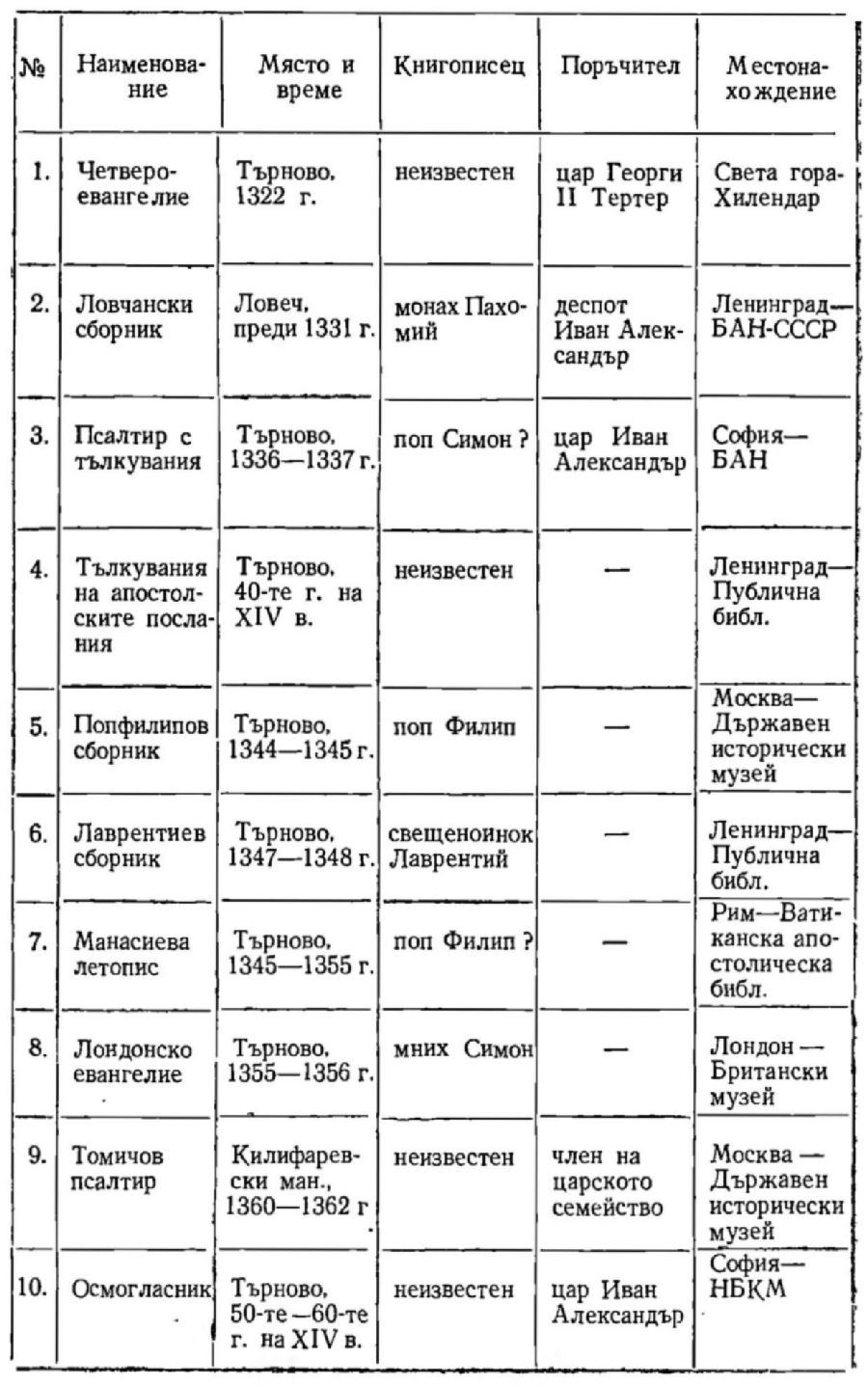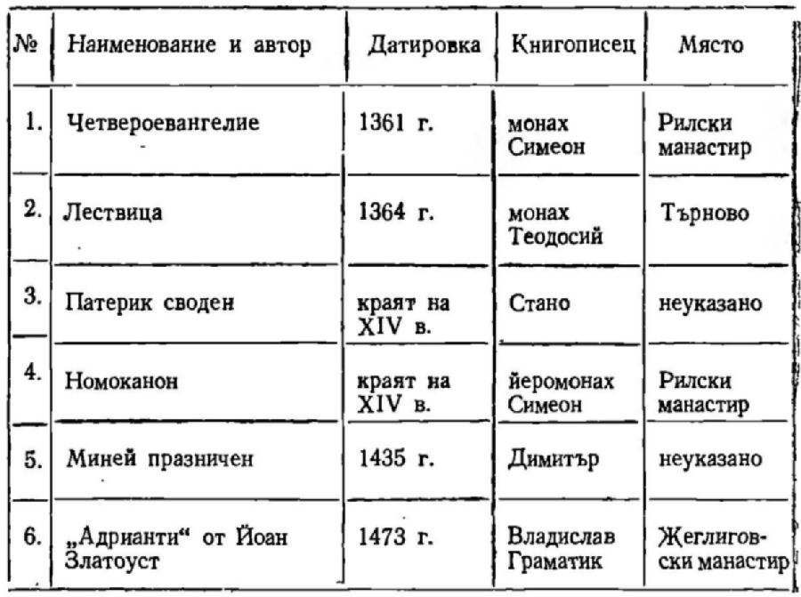 Евангелие с апостол, Хилендарско евангелие, Миханичов сборник, Средецко евангелие, Станиславов пролог, Ловчански сборник, Кукленски песнивец, Тълковно евангелие, Апостол с тълкувания, Митрофанов пролог, Оливеров миней, Манасиева летопис, Висарионов патерик, Хлудов сборник, „Главы зѣло полѣзные" на Григорий Синаит, Лаврентиев сборник, Тълковно евангелие, Пандекти на Никон Черногорец, Мюнхенски требник, Римски патерик, Скитски патерик, 15 книги (евангелие, апостол, богородичник и др.), 7 псалтира, 5 часослова, 4 литургии, 3 лествици и др., Поучения на Ефрем Сирин, Октоих, Цветен и постен триод, Евангелие, цветослов и сборник, Лесновски паренесис, Охридски паренесис, Лондонско евангелие, Зографски апостол, Германов сборник, Видинско евангелие, Бдински сборник, Първославов сборник, „Маргарит", Томичов псалтир, Рилско евангелие, Рилска лествица, Охридски пролог, Празничен миней, Видински апостол, Съчинения на Дионисий Ареопагит, Сборник с аскетично съдържание, Празничен миней, Дамянов пролог, Положки ръкопис, Пергаментово евангелие, Евтимиев служебник, Слова на Исак Сирин, Зографски чети-миней, Колекция „Студион" 10 тома ]]