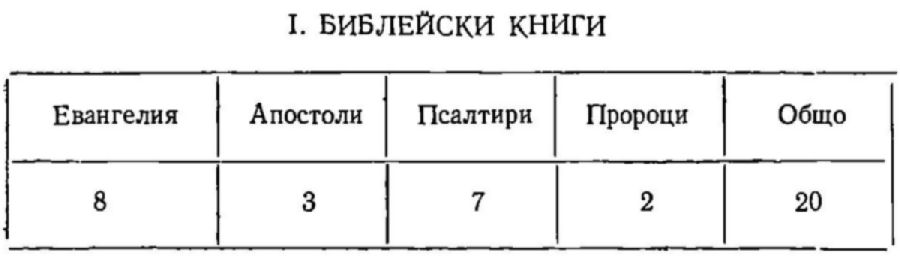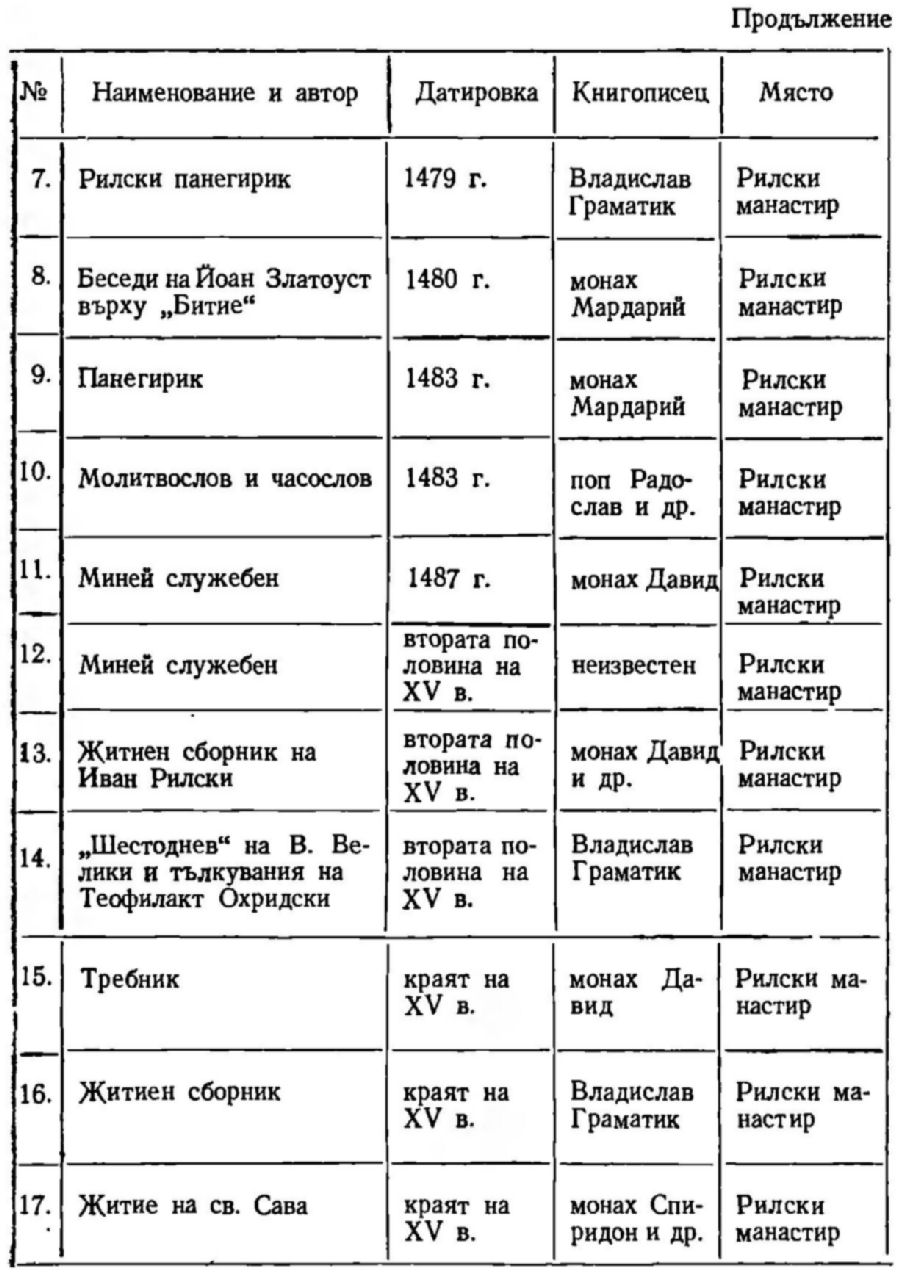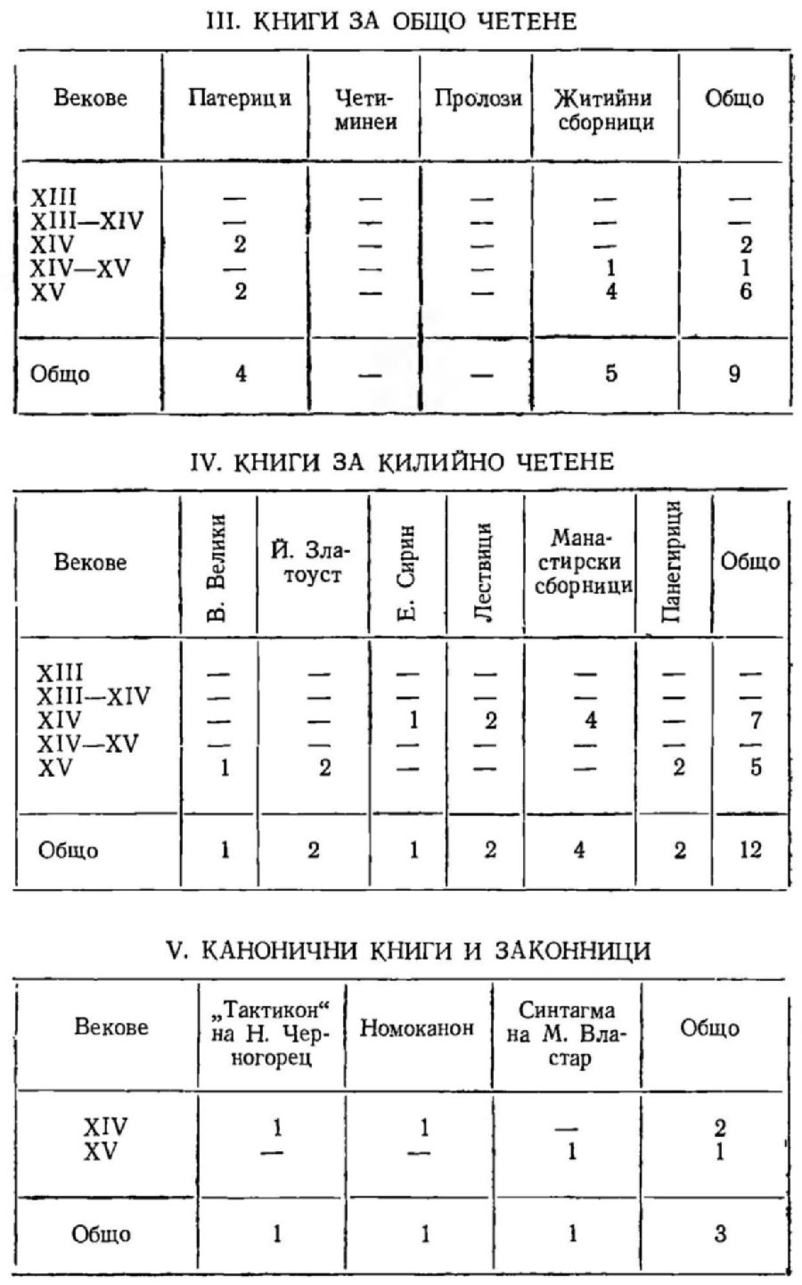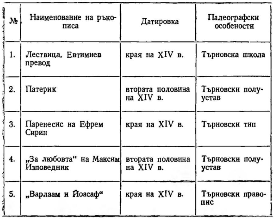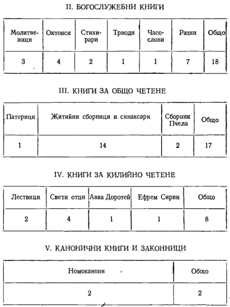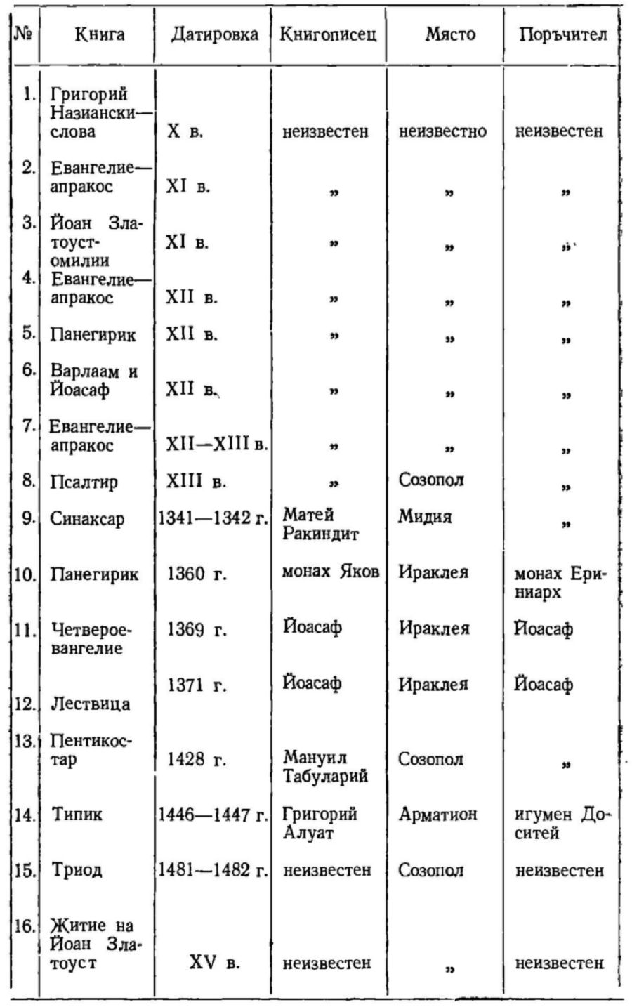 Евангелие с апостол, Хилендарско евангелие, Миханичов сборник, Средецко евангелие, Станиславов пролог, Ловчански сборник, Кукленски песнивец, Тълковно евангелие, Апостол с тълкувания, Митрофанов пролог, Оливеров миней, Манасиева летопис, Висарионов патерик, Хлудов сборник, „Главы зѣло полѣзные" на Григорий Синаит, Лаврентиев сборник, Тълковно евангелие, Пандекти на Никон Черногорец, Мюнхенски требник, Римски патерик, Скитски патерик, 15 книги (евангелие, апостол, богородичник и др.), 7 псалтира, 5 часослова, 4 литургии, 3 лествици и др., Поучения на Ефрем Сирин, Октоих, Цветен и постен триод, Евангелие, цветослов и сборник, Лесновски паренесис, Охридски паренесис, Лондонско евангелие, Зографски апостол, Германов сборник, Видинско евангелие, Бдински сборник, Първославов сборник, „Маргарит", Томичов псалтир, Рилско евангелие, Рилска лествица, Охридски пролог, Празничен миней, Видински апостол, Съчинения на Дионисий Ареопагит, Сборник с аскетично съдържание, Празничен миней, Дамянов пролог, Положки ръкопис, Пергаментово евангелие, Евтимиев служебник, Слова на Исак Сирин, Зографски чети-миней, Колекция „Студион" 10 тома ]]