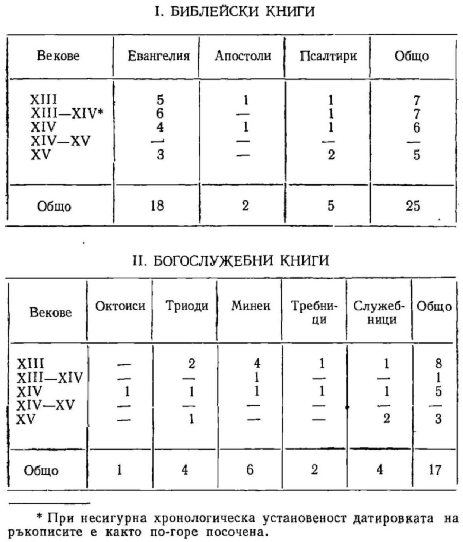 При датировката на отделните ръкописи са взети под внимание уточненията на Б. Христова, Д. Караджова и А. Икономова, Български ръкописи от XI до XVII в., запазени в България (Своден каталог), I, С., 1982.