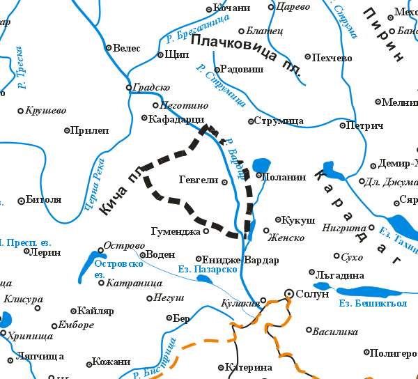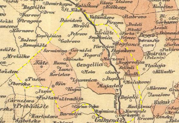 Гевгелийската Каза е ново устроена, за това тя не личи въ по-старитѣ статистики. Съставена е отъ села на Кукушката, Дойранската и прѣжня Мегленска Каза, която сега не сѫществува. Други части отъ Мегленската Каза сѫ дадени на Воденската и Енидже-Вардарската Каза.