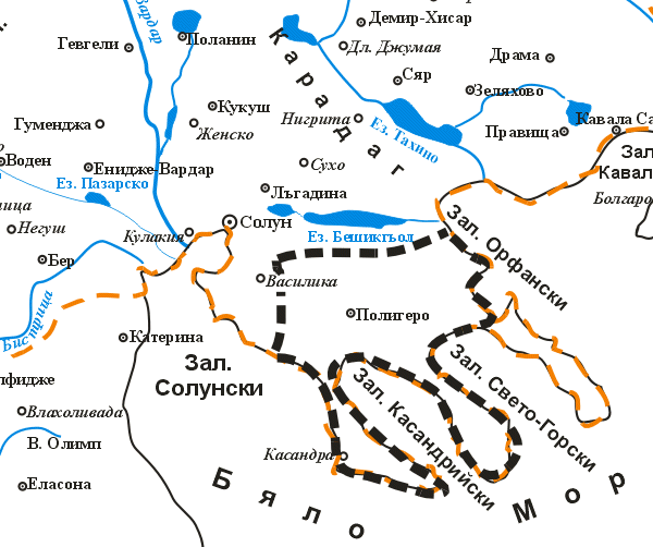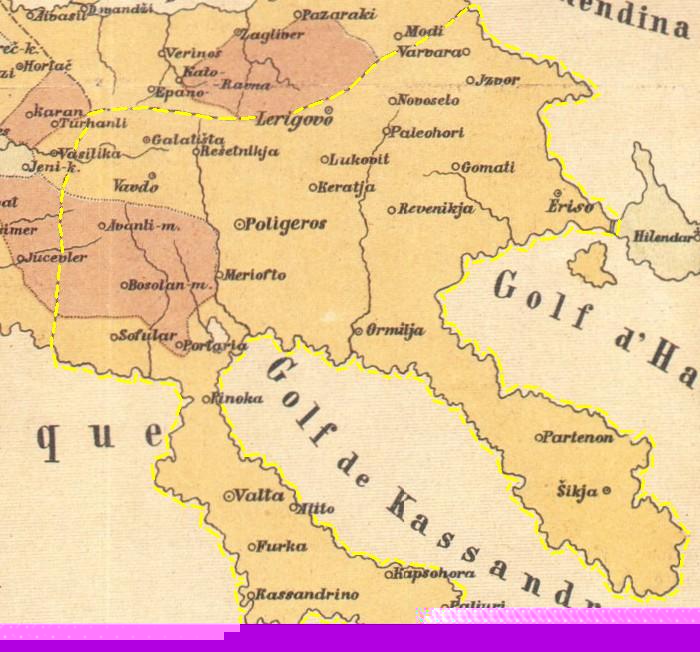 Въ казата Касандра има 73 метоси, които принадлежатъ на светогорски манастири. Въ всѣки единъ отъ тия метоси има по 5—6 души слуги, въ нѣкои и повече. Ние ги не туряме въ нашата смѣтка, понеже тѣ иматъ по разни села домове и къмъ тѣхъ се причисляватъ.