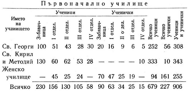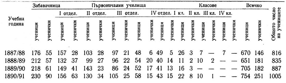 За да бъде по-нагледен напредъкът, който са направили училищата в най-ново време, ние излагаме тук една сравнителна таблица за числото на учащите се през последните четири учебни години.