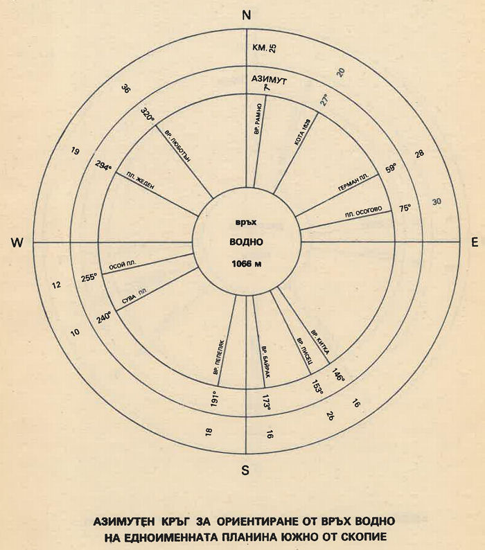 АЗИМУТЕН КРЪГ ЗА ОРИЕНТИРАНЕ ОТ ВРЪХ ВОДНО НА ЕДНОИМЕННАТА ПЛАНИНА ЮЖНО ОТ СКОПИЕ