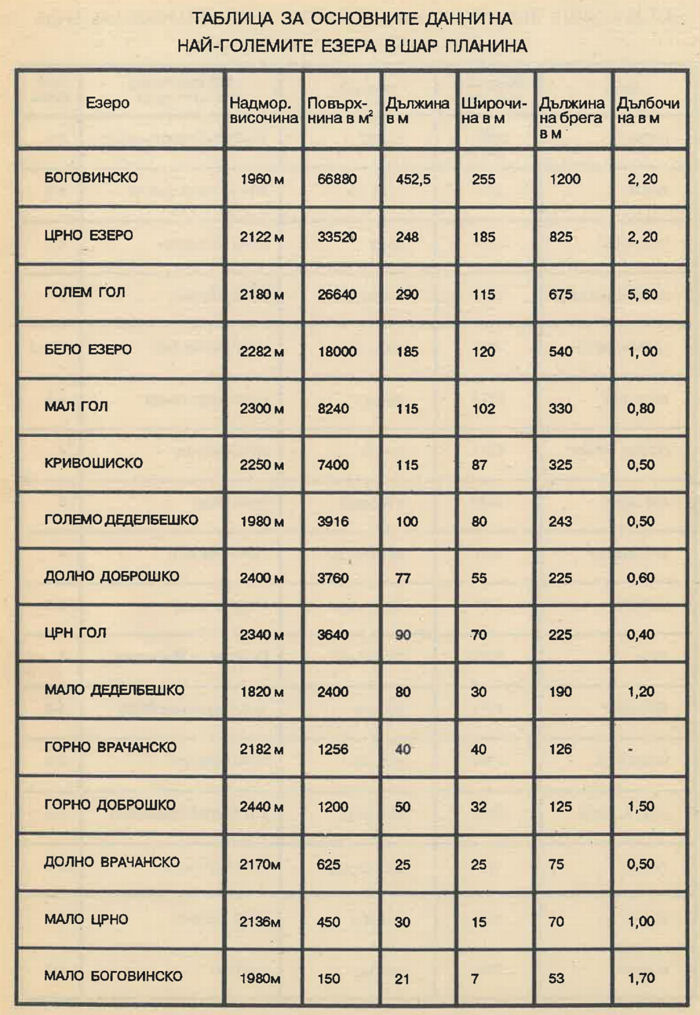ТАБЛИЦА ЗА ОСНОВНИТЕ ДАННИ НА НАЙ-ГОЛЕМИТЕ ЕЗЕРА В ШАР ПЛАНИНА